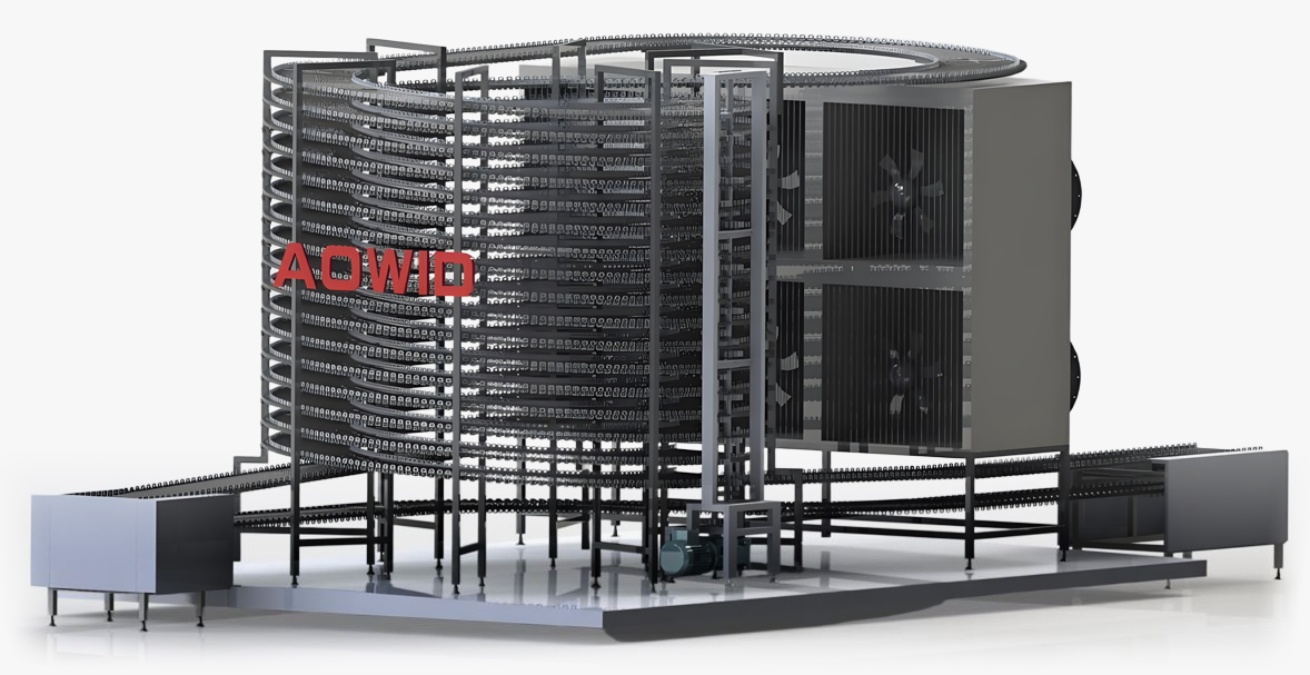 ● También es un tipo de sistema de enfriamiento por aire avanzado y eficiente, que se utiliza ampliamente en muchas industrias, especialmente en el campo de procesamiento de alimentos. Enfría los productos (como productos de panadería de horno o papas fritas de frying máquina) por aire de temperatura ambiente (a veces adoptan ventiladores circulantes).